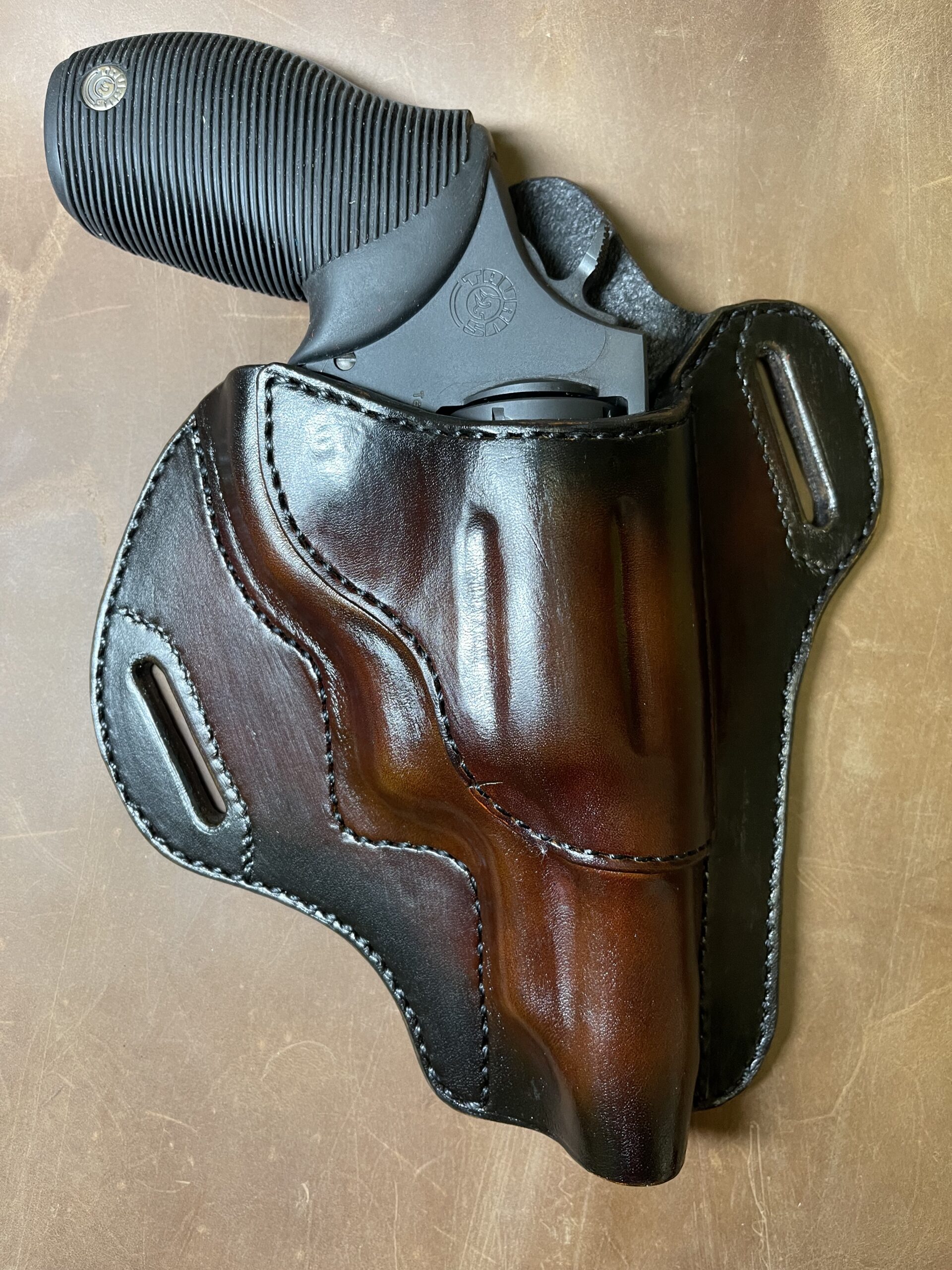 The gun holster can be done for any pistol, in a variety of colors. These holsters do not have tooling on them and are outside the waistband holsters. They are wet molded to your particular type of gun. In some instances, Blue Guns can’t be found for your particular gun and we would need your gun to make sure you have tight fitting holster. Please contact us to find out more details on how we can make you a custom holster.