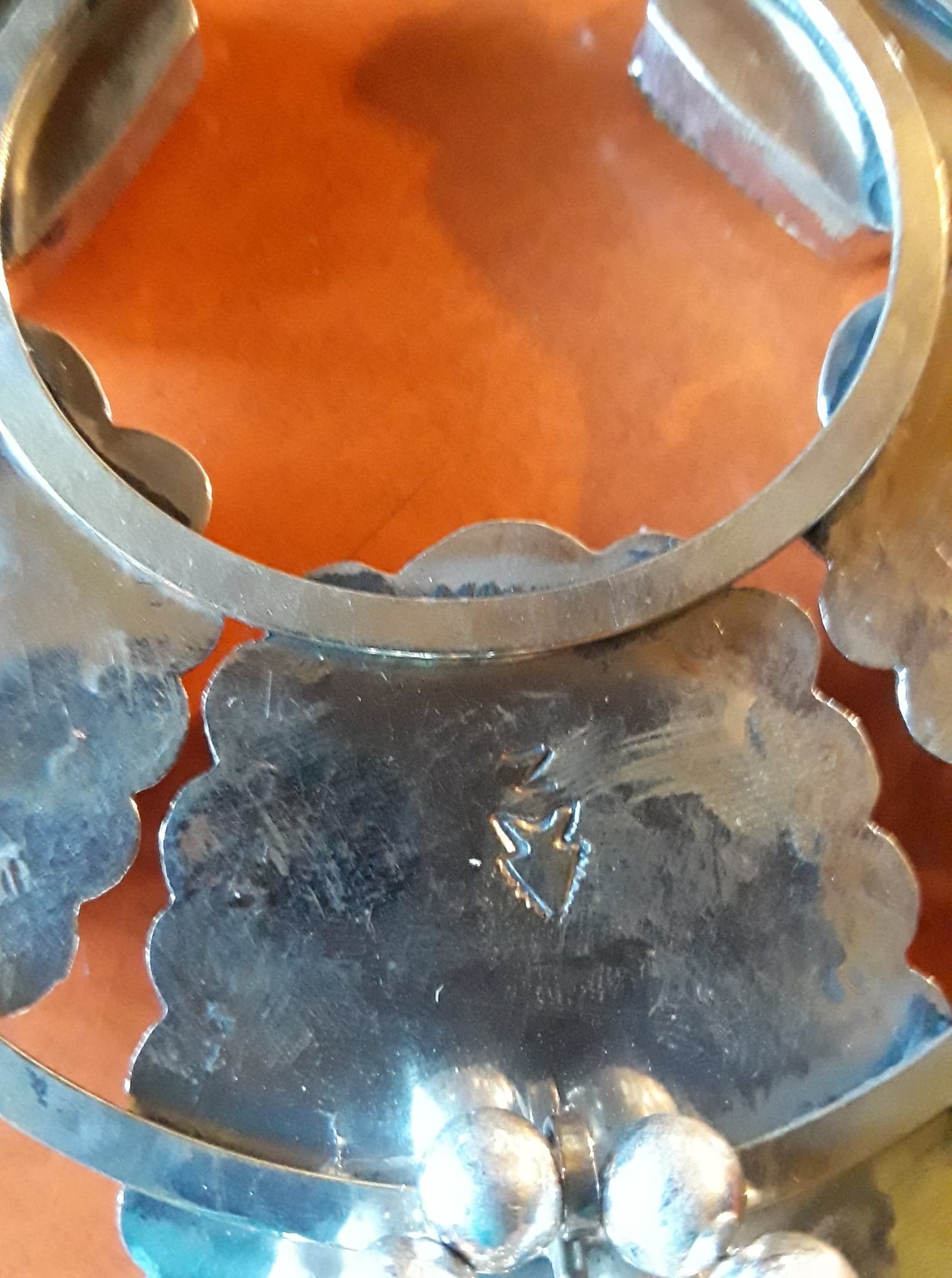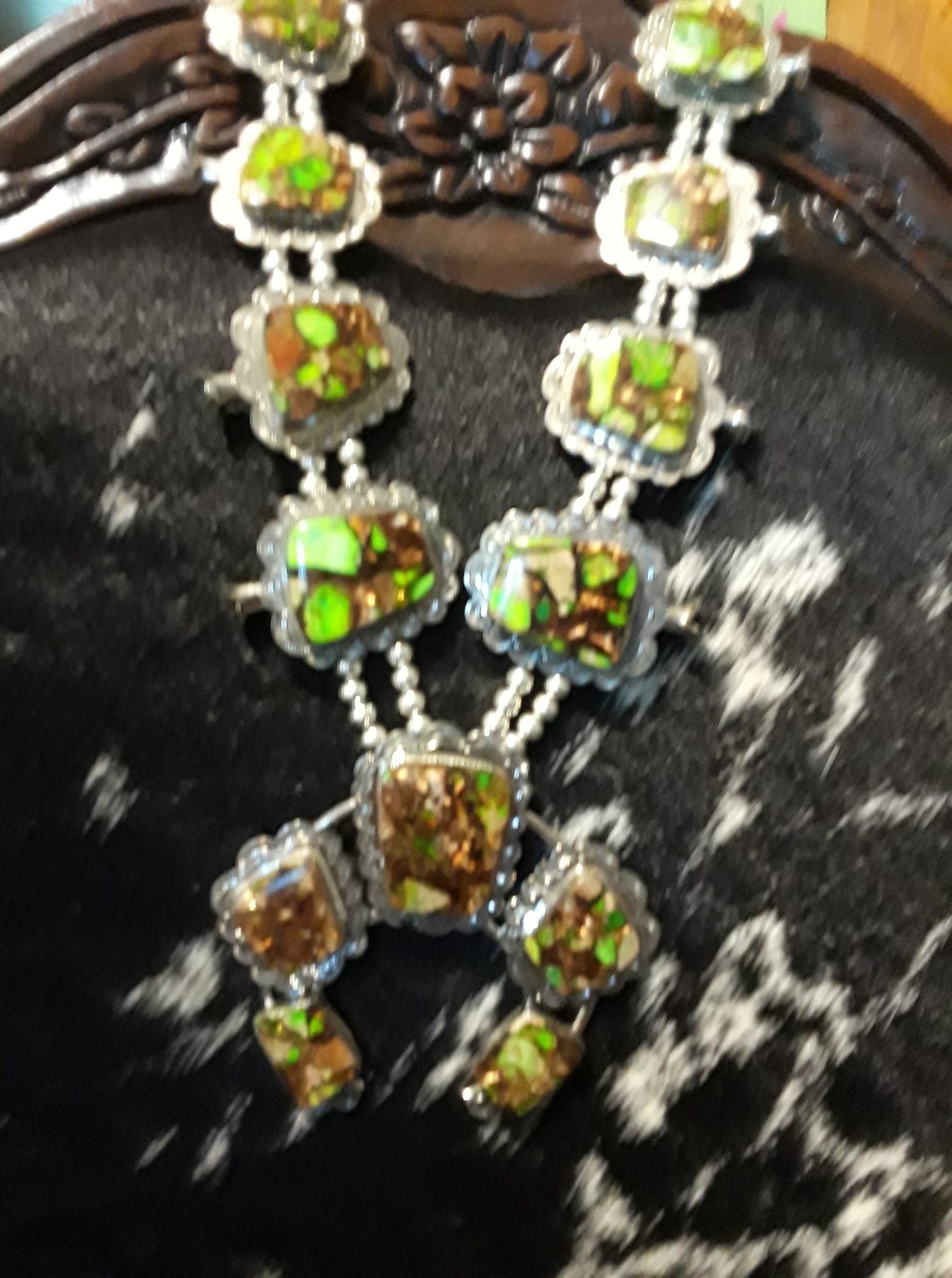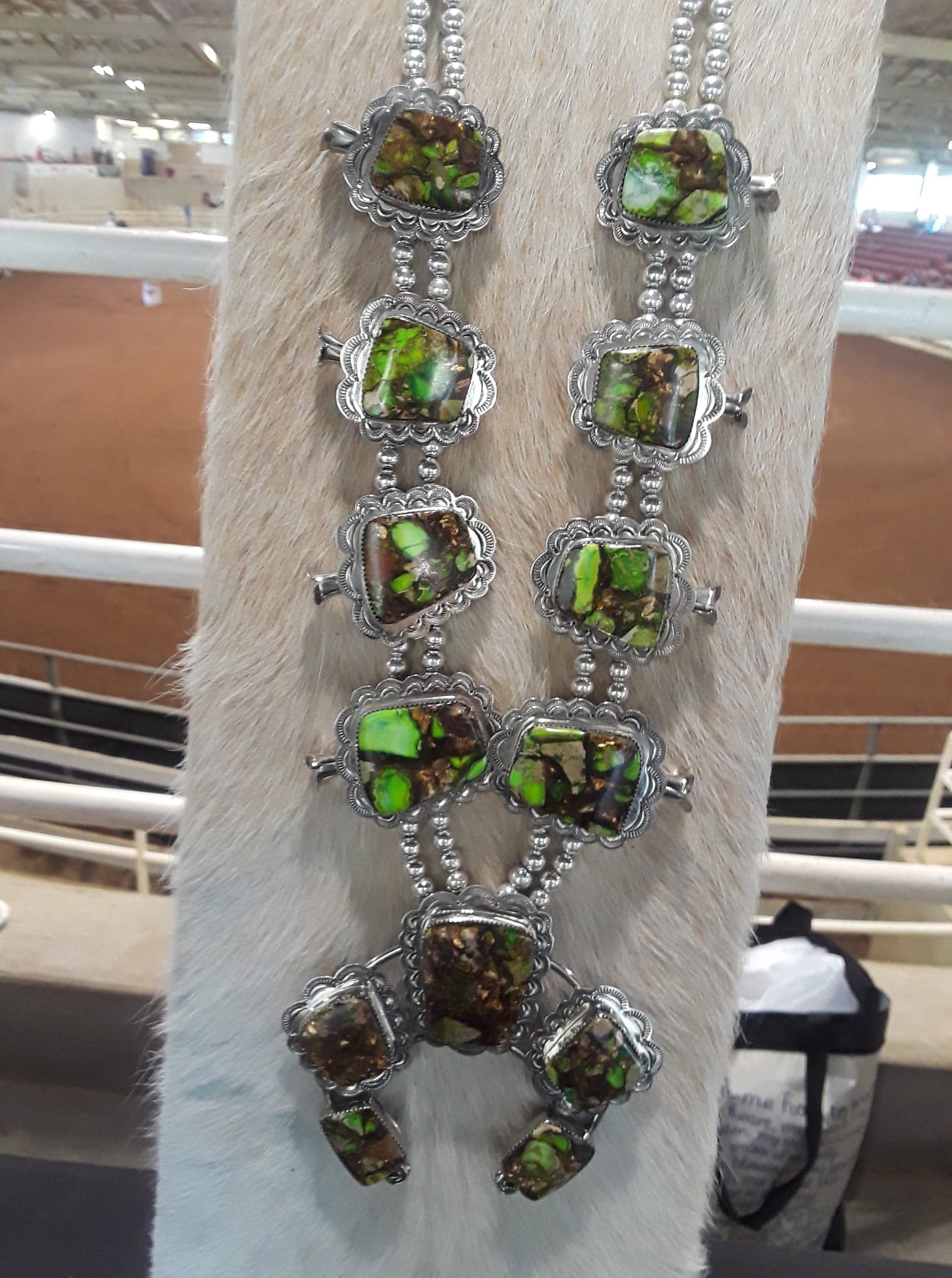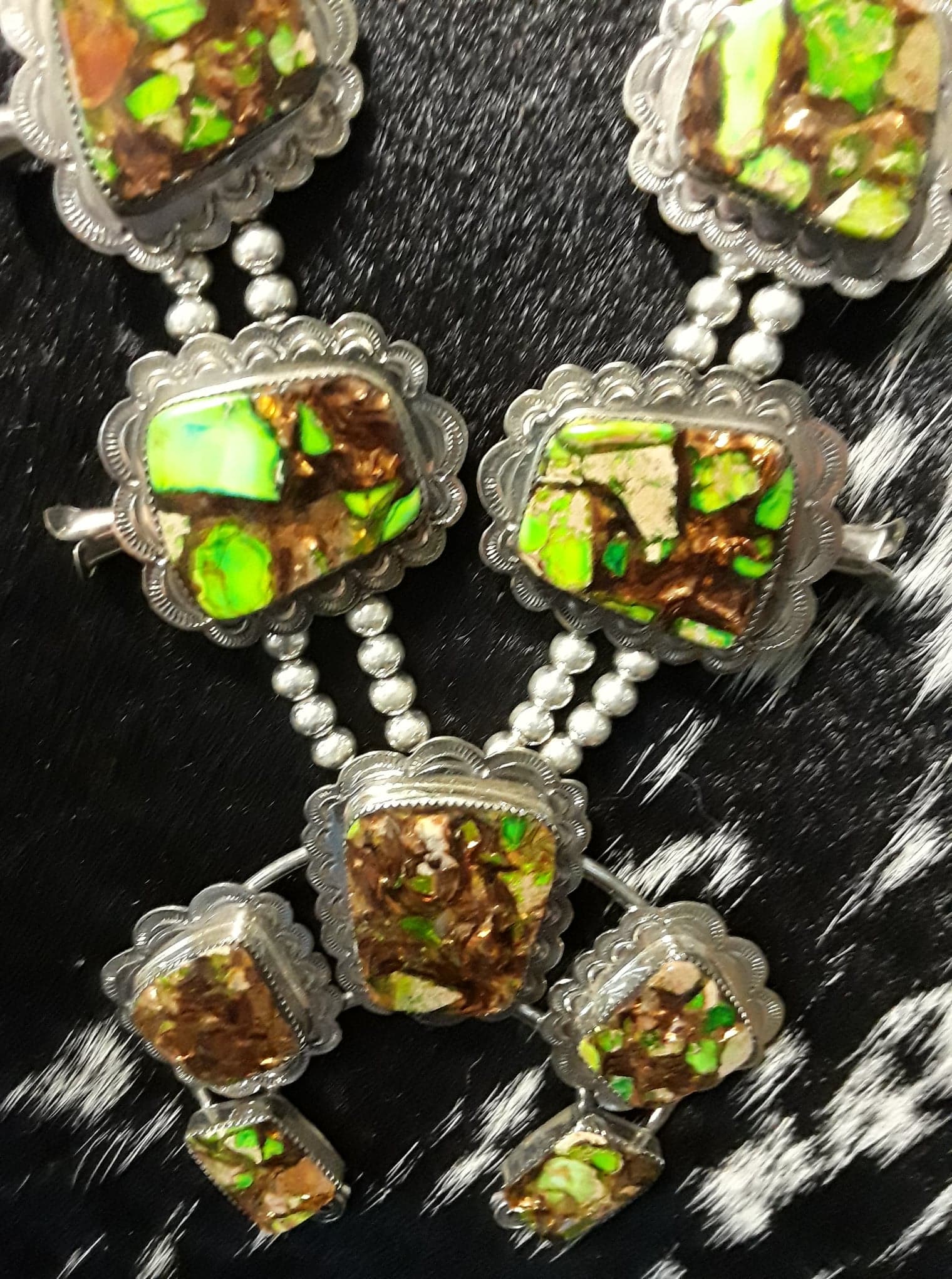 Green Imperial Jasper Squash Blossom set in 100% Sterling Silver.  SOLD. If you are interested in this necklace, let us know and we will be happy to see if we can get another one made.