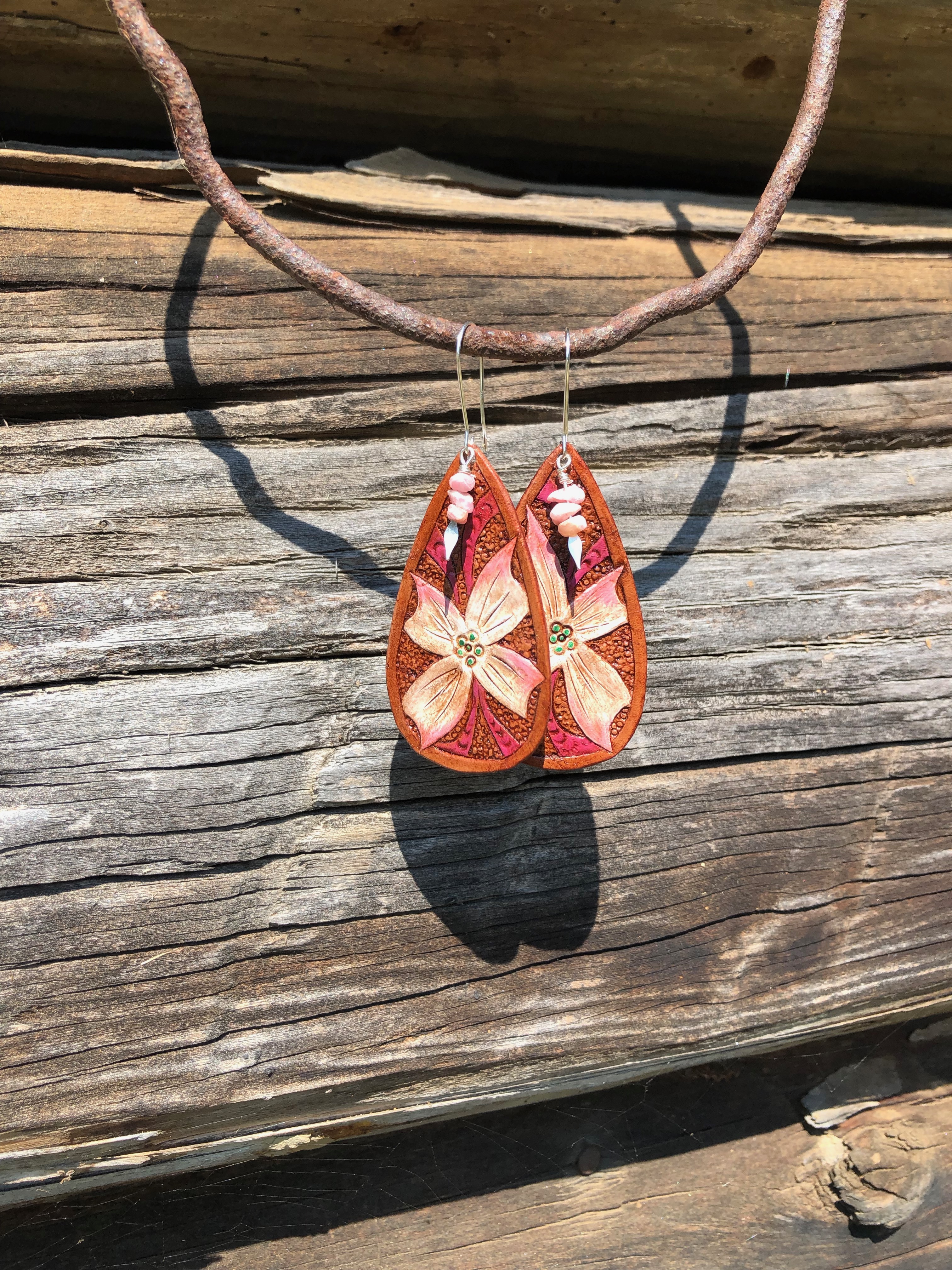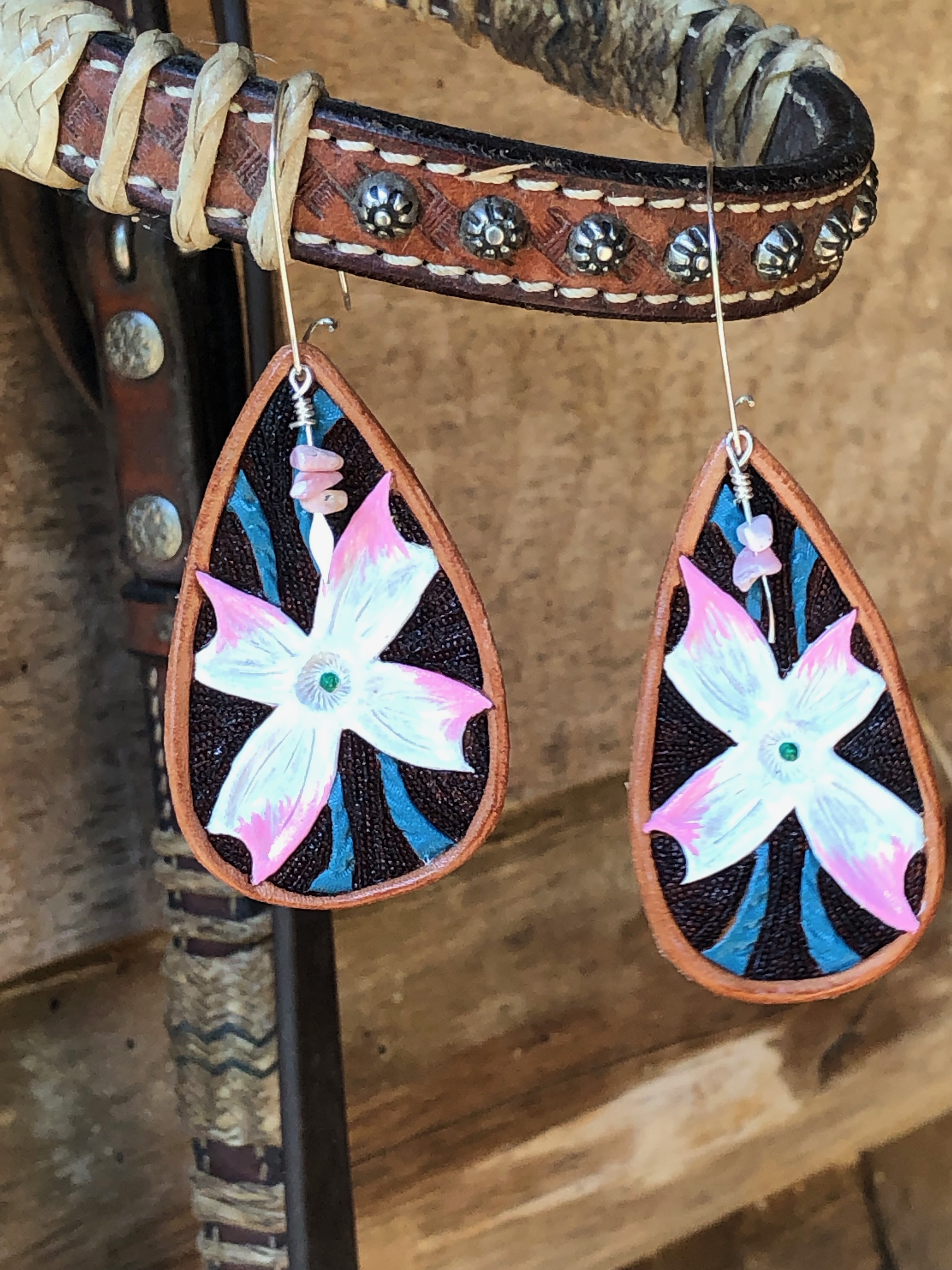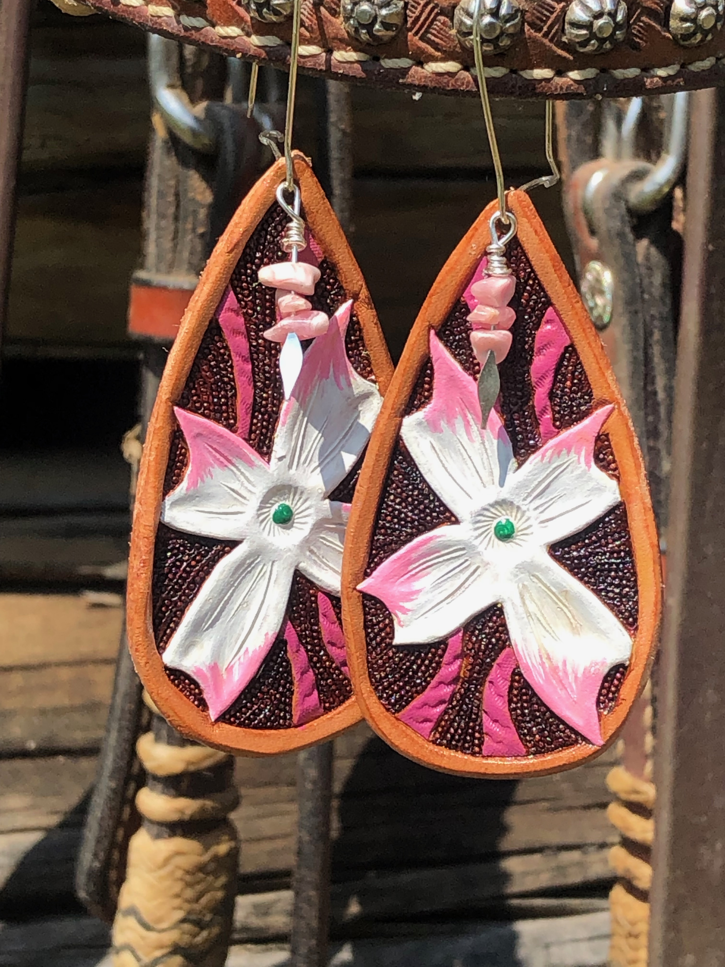 Beautiful handmade leather dogwood flower earrings with sterling Silver and Rhodocrosite precious stone. Can be made to order with customized ribbon colors. Make sure you specify which ones you want otherwise we’ll probably send you pink.