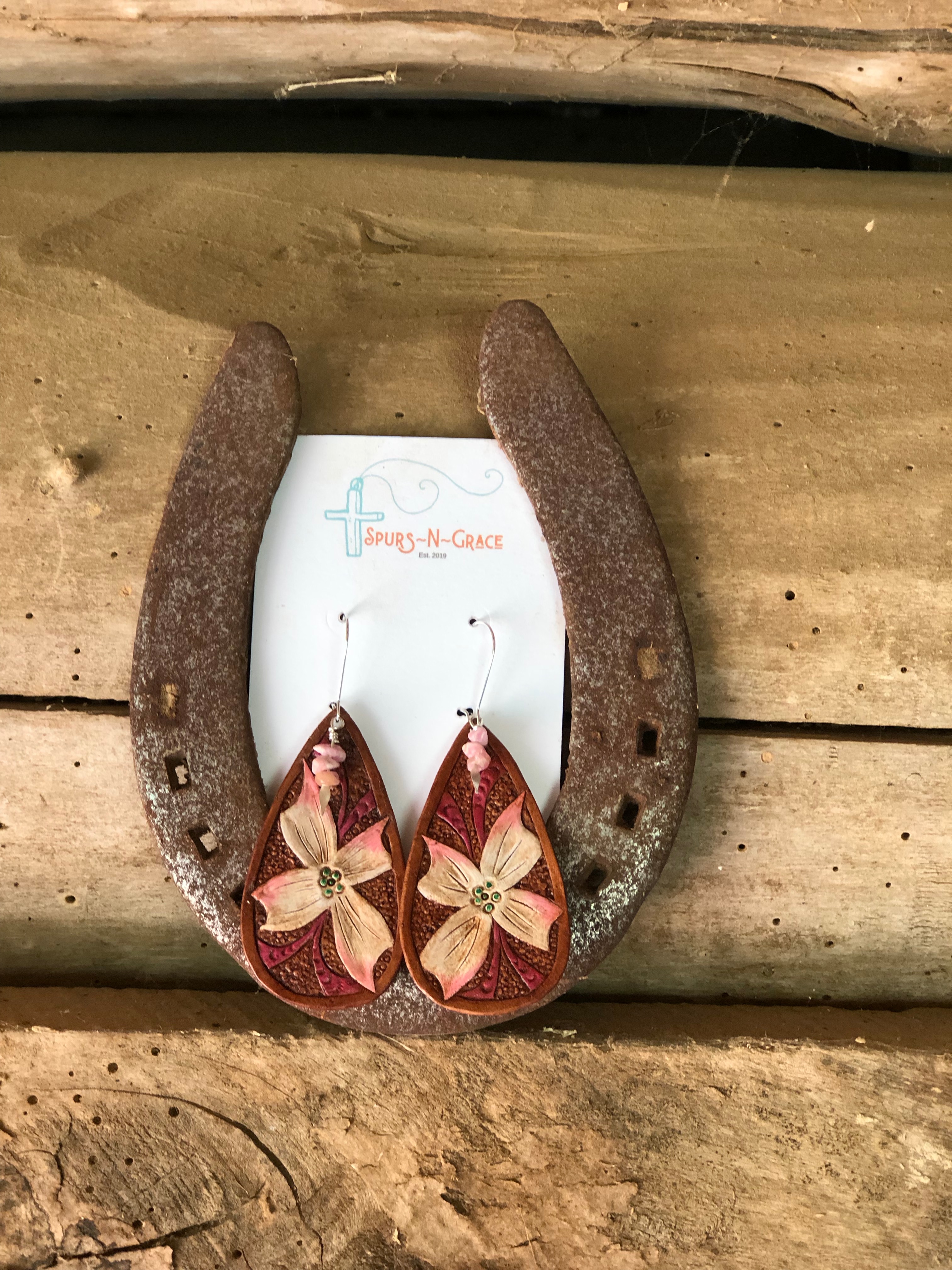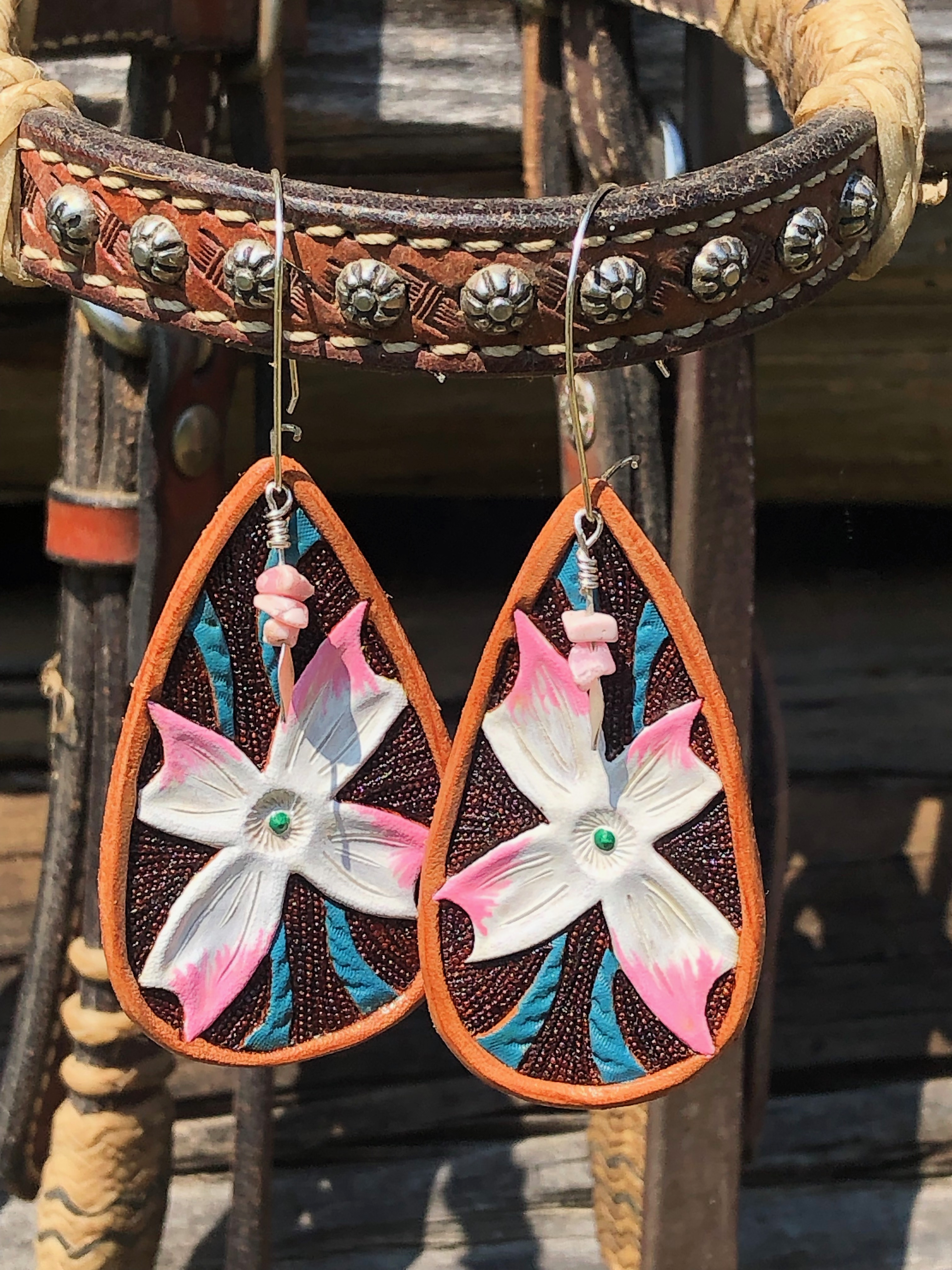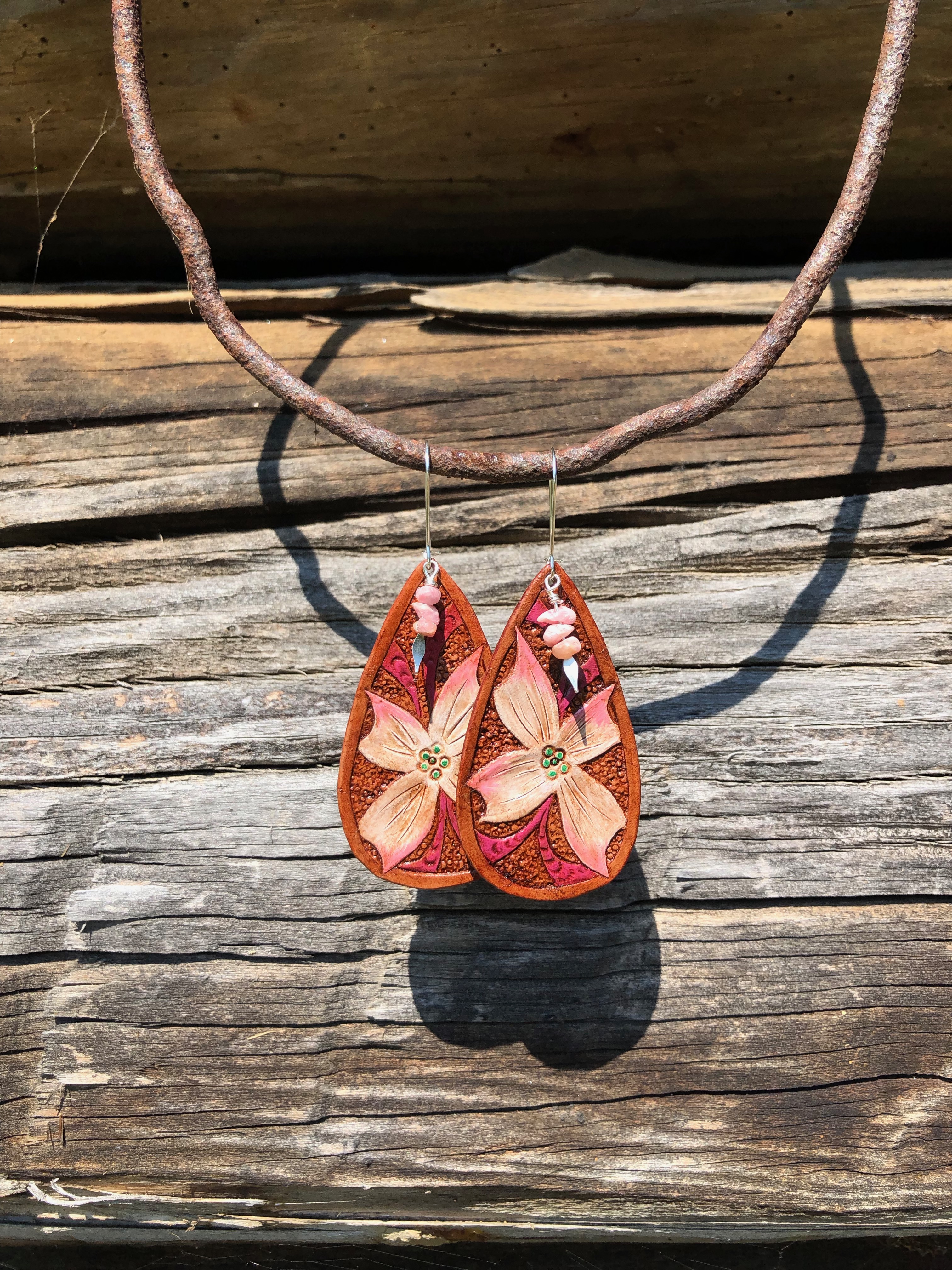 Beautiful handmade leather dogwood flower earrings with sterling Silver and Rhodocrosite precious stone. Can be made to order with customized ribbon colors. Make sure you specify which ones you want otherwise we’ll probably send you pink.