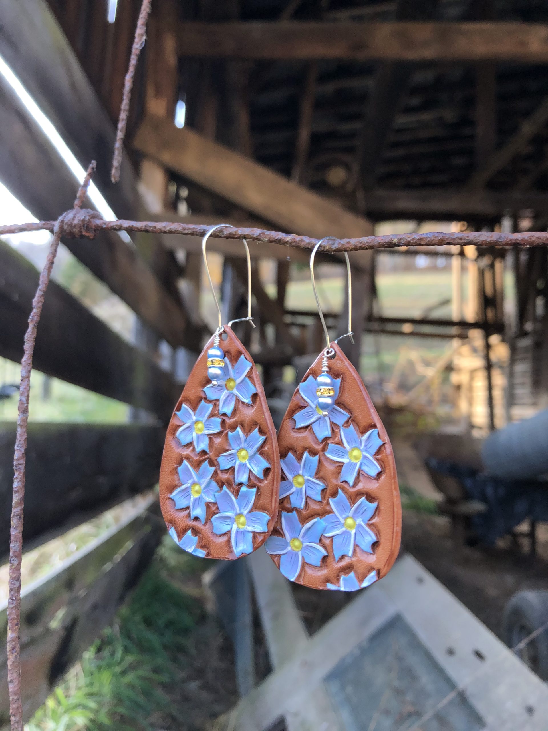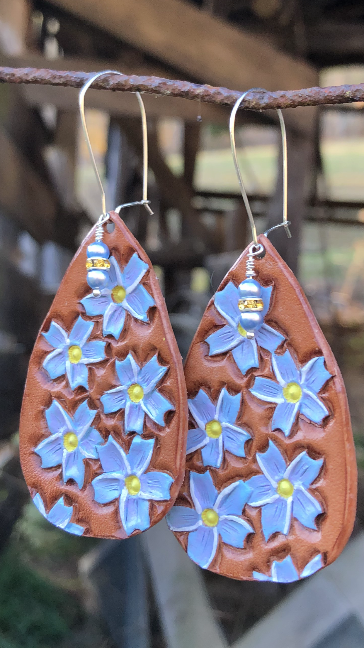 Beautiful handmade leather Forget-Me-Knots with sterling silver findings and blue pearls/yellow Swarovski Crystal beads.  I’ve painted them to match what is commonly found in the wild.  We hope that you’ll find this flower suitable in remembrance of a close friend or loved one that you’ve lost.  We will be happy to do these in other color upon request, just contact us to let us know what color you’d like.