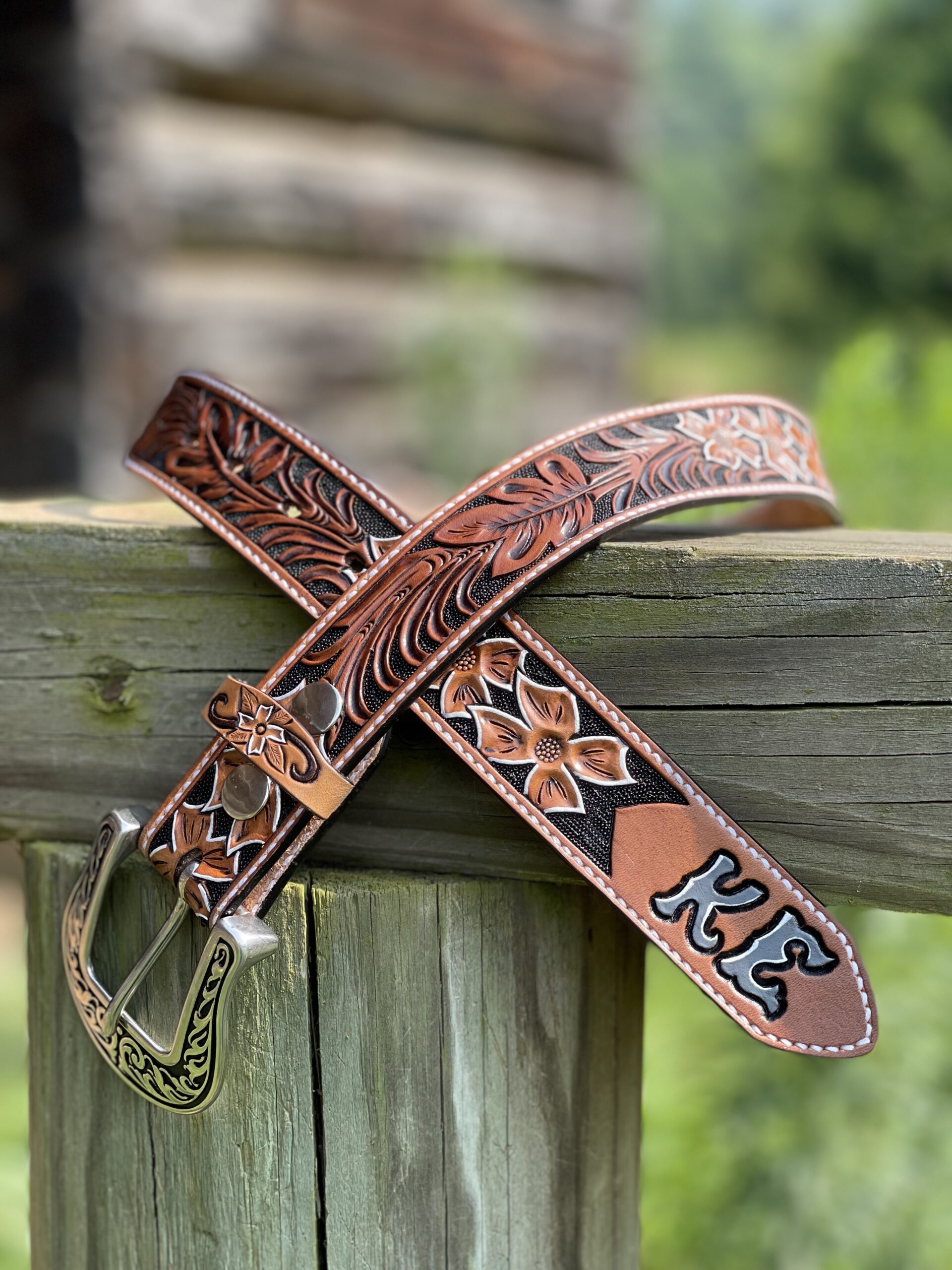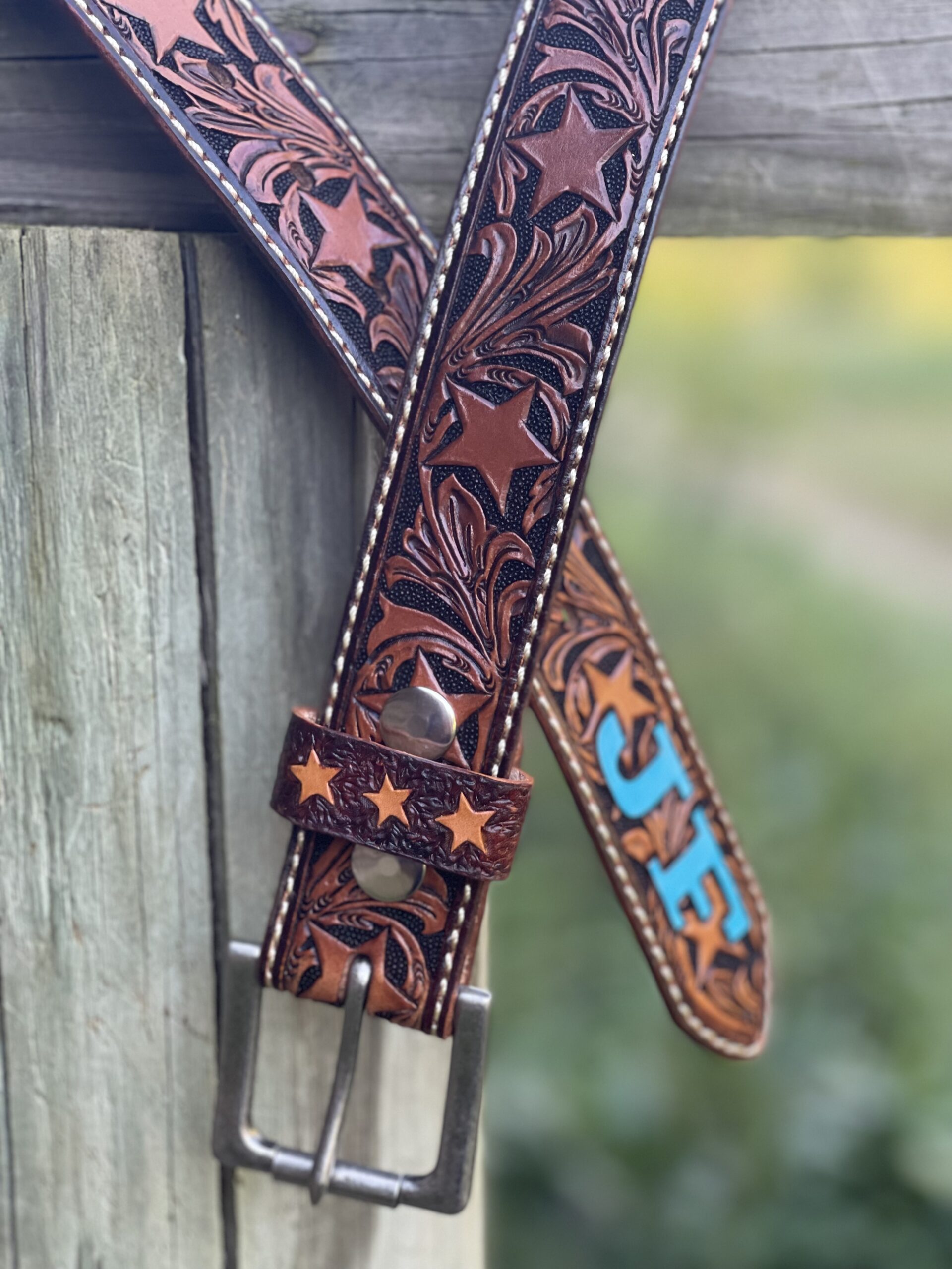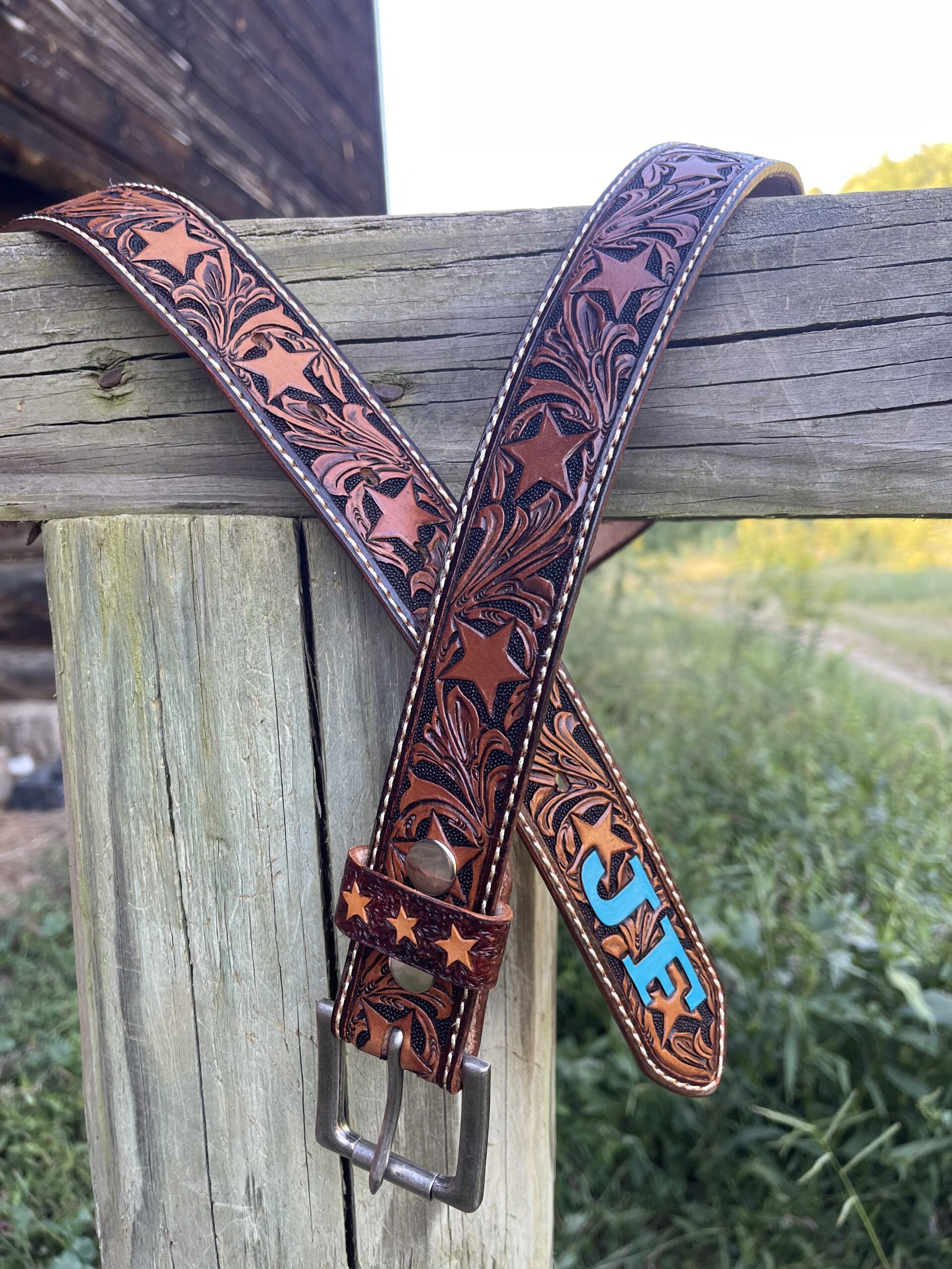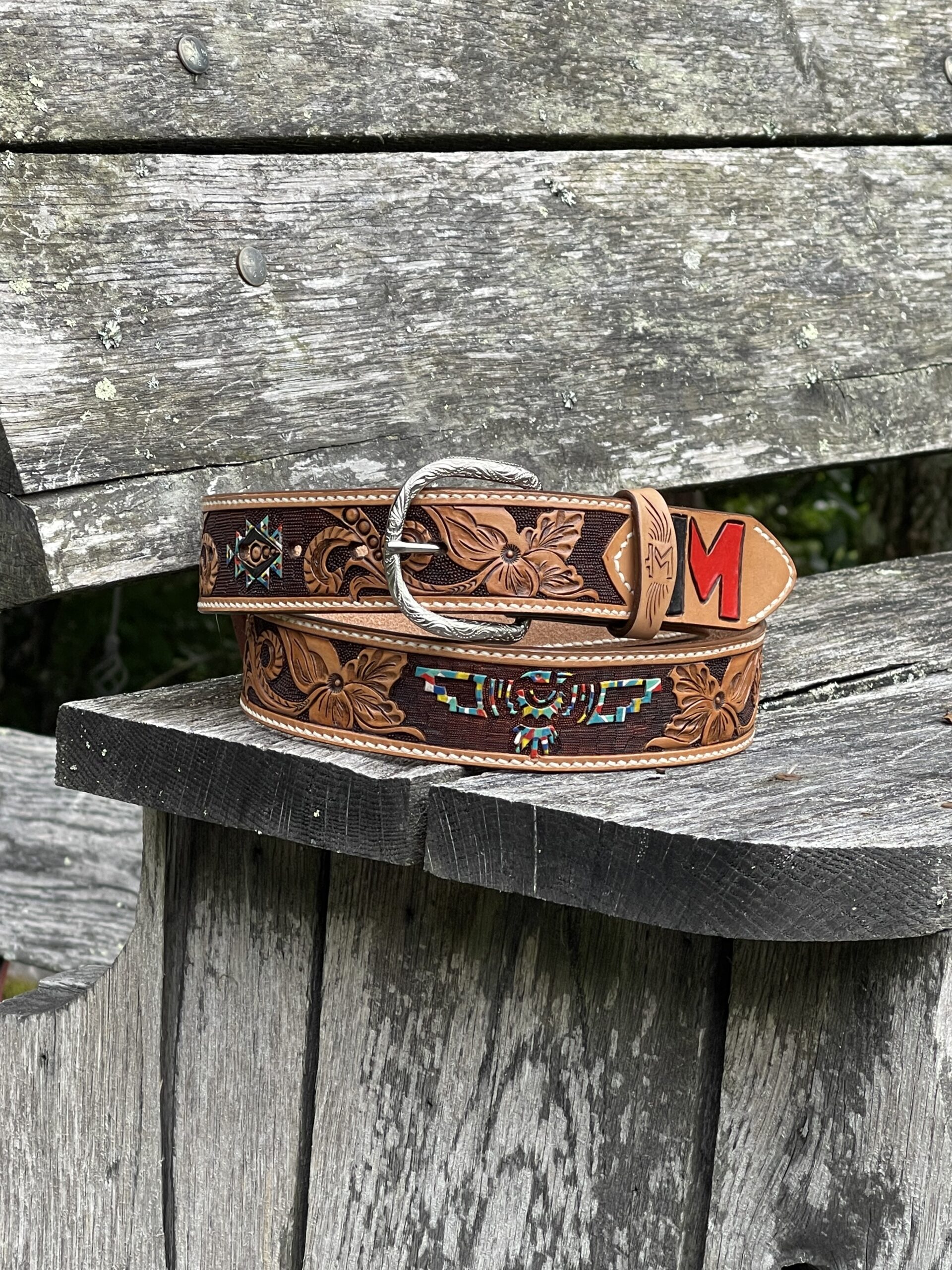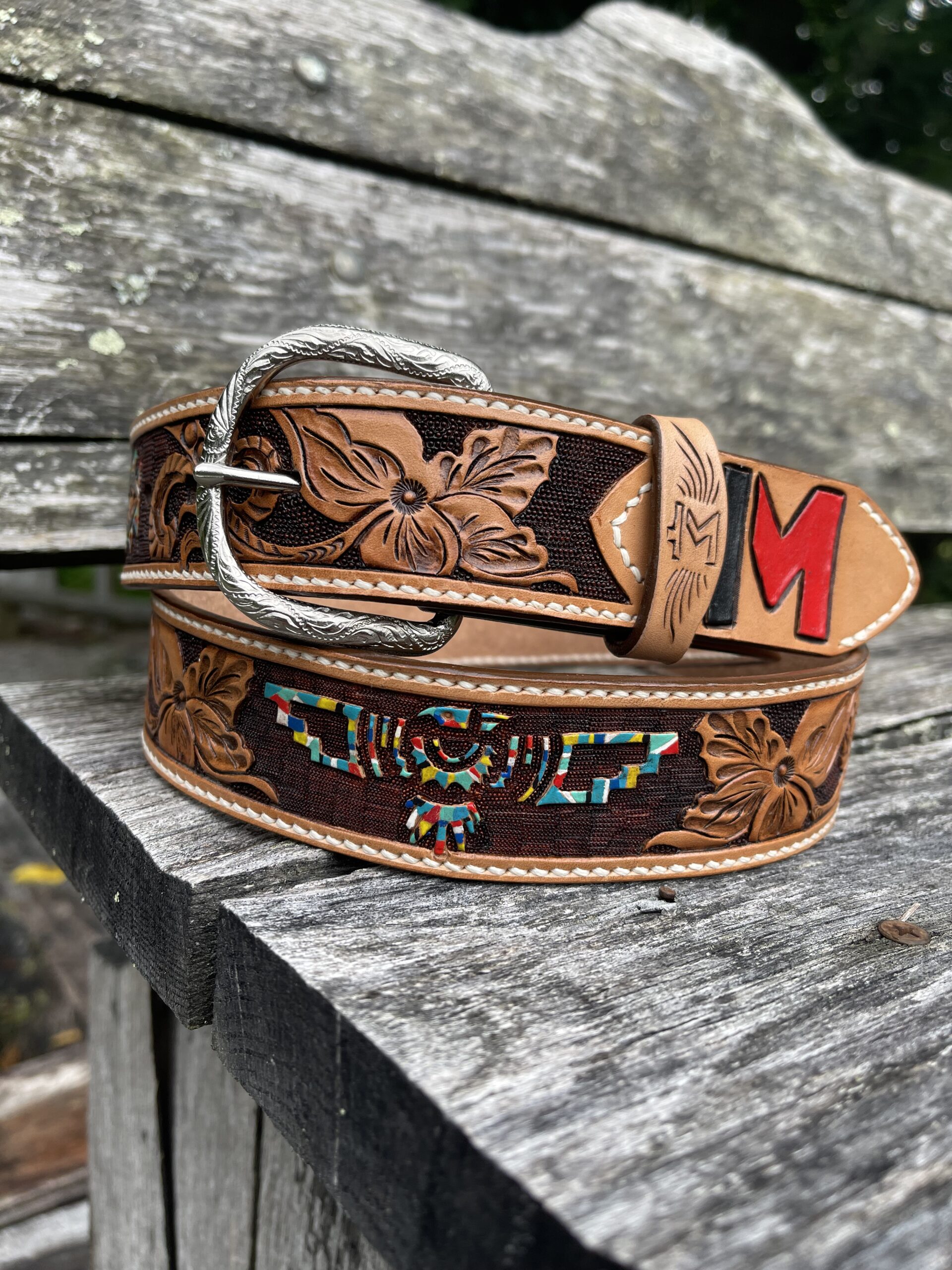 The Works!! Custom tooled belts with stitching and western style buckle.