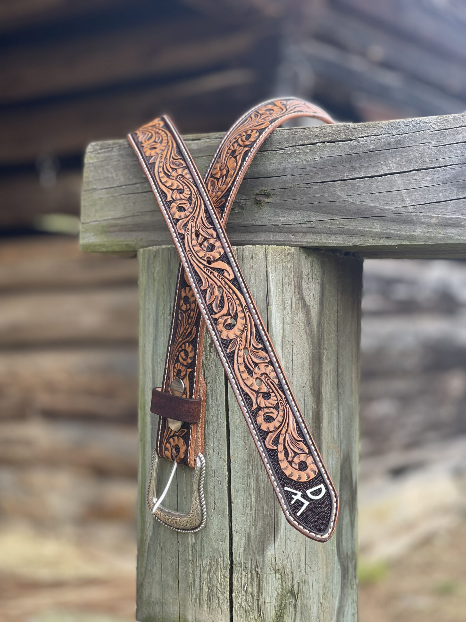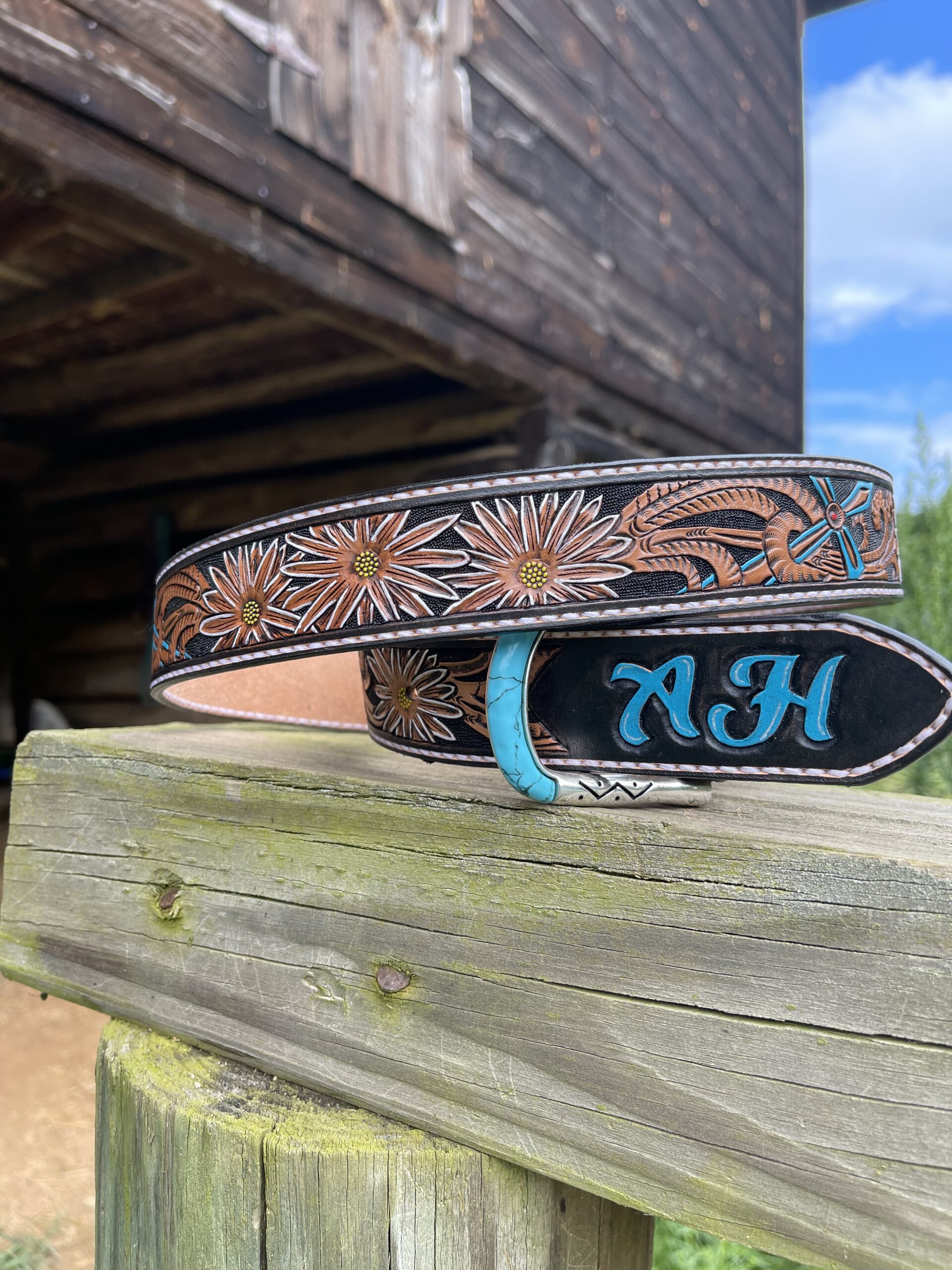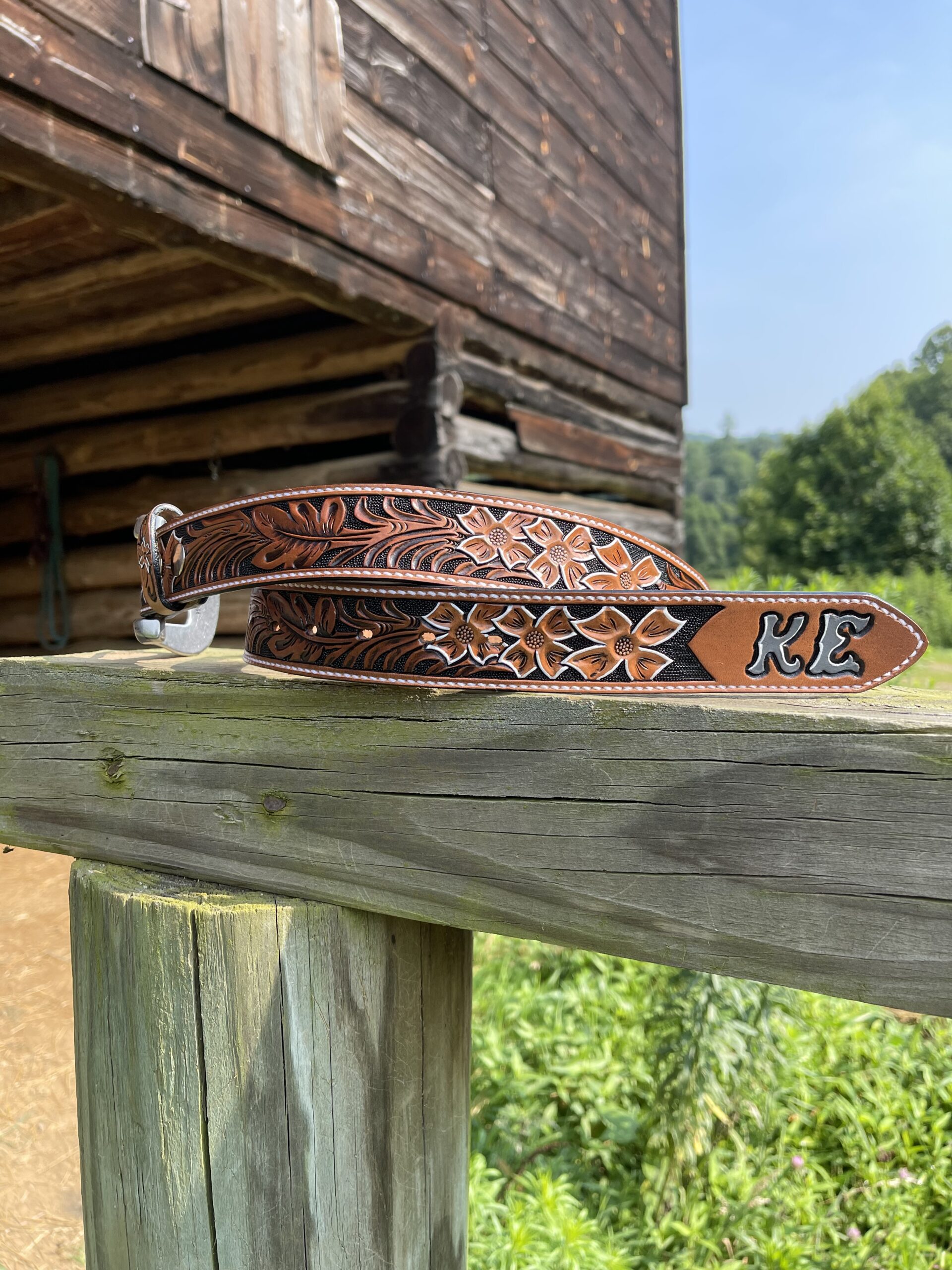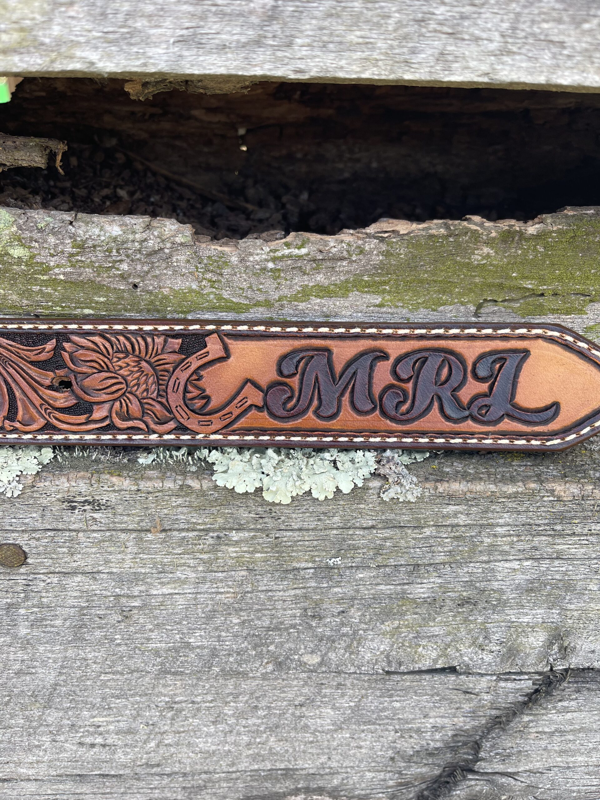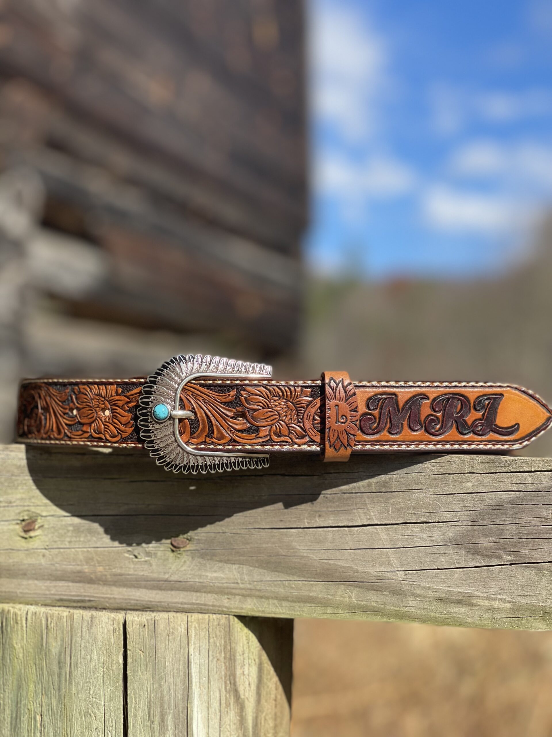 The Works!! Custom tooled belts with stitching and western style buckle.
