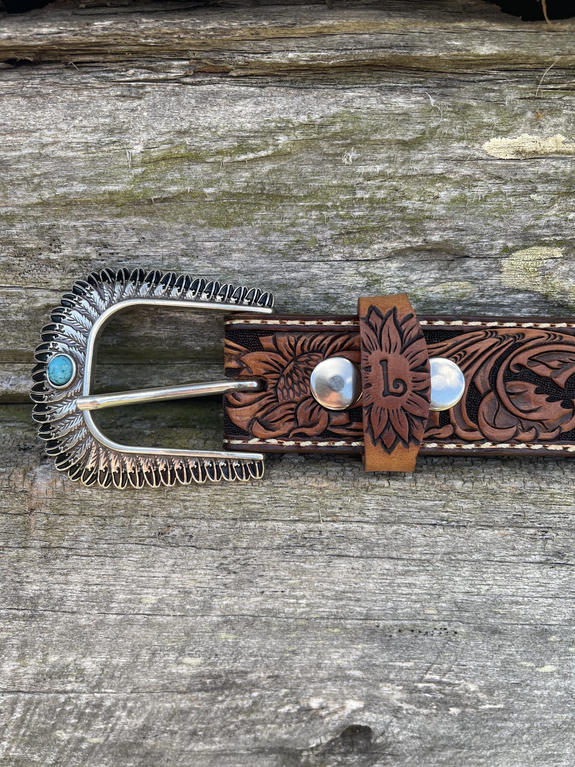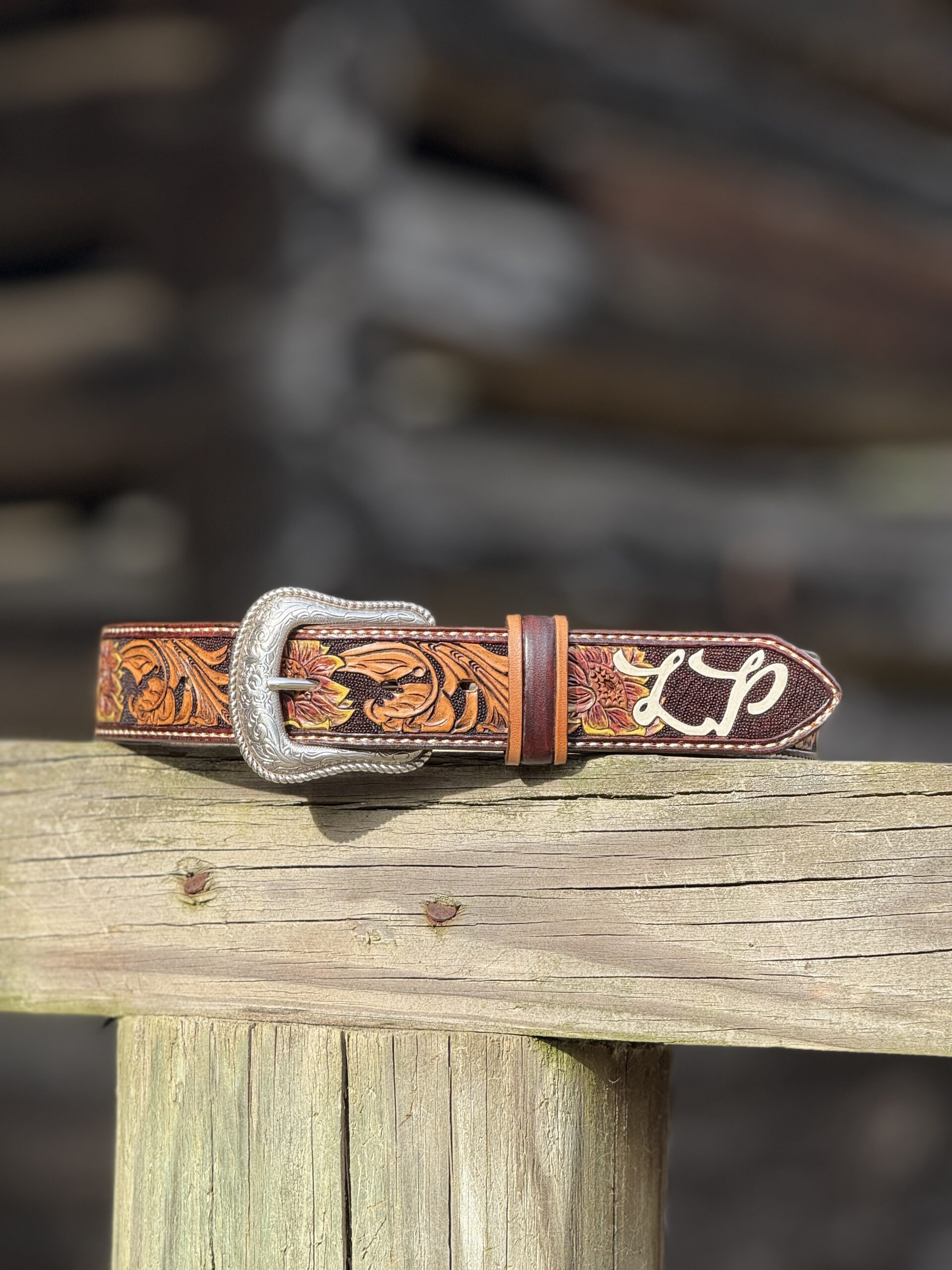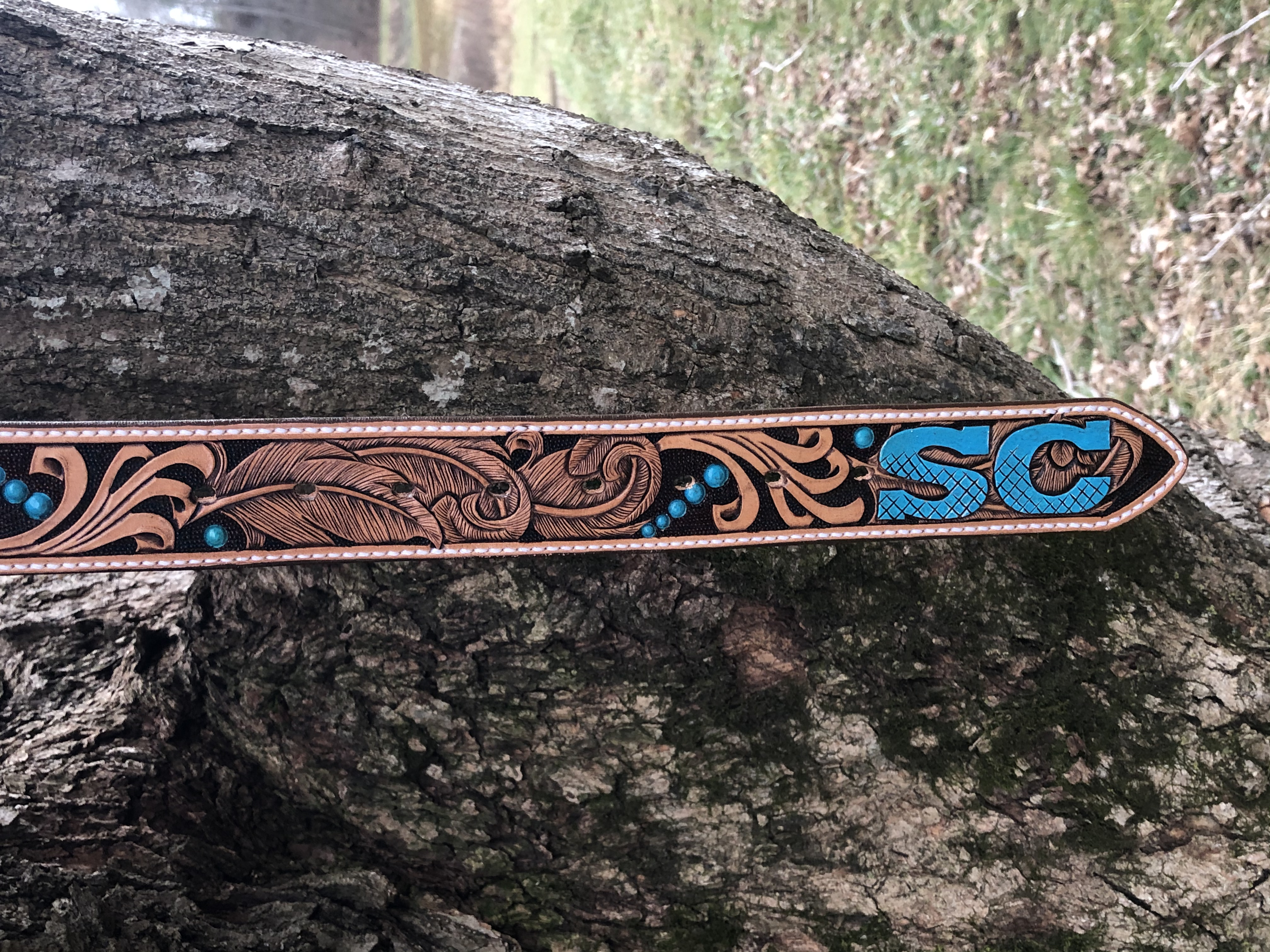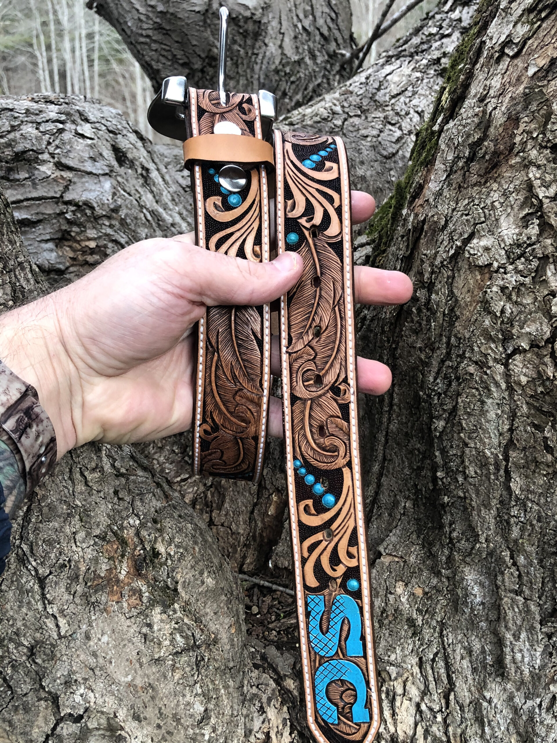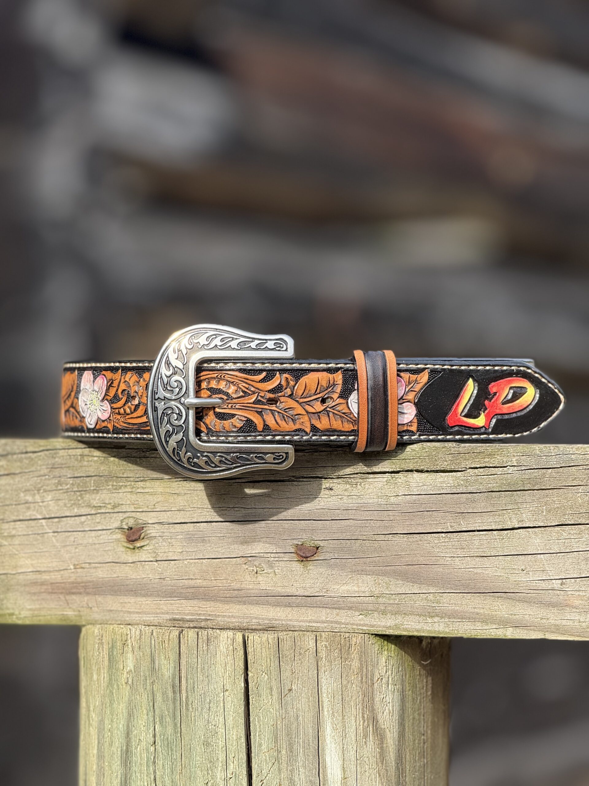 The Works!! Custom tooled belts with stitching and western style buckle.