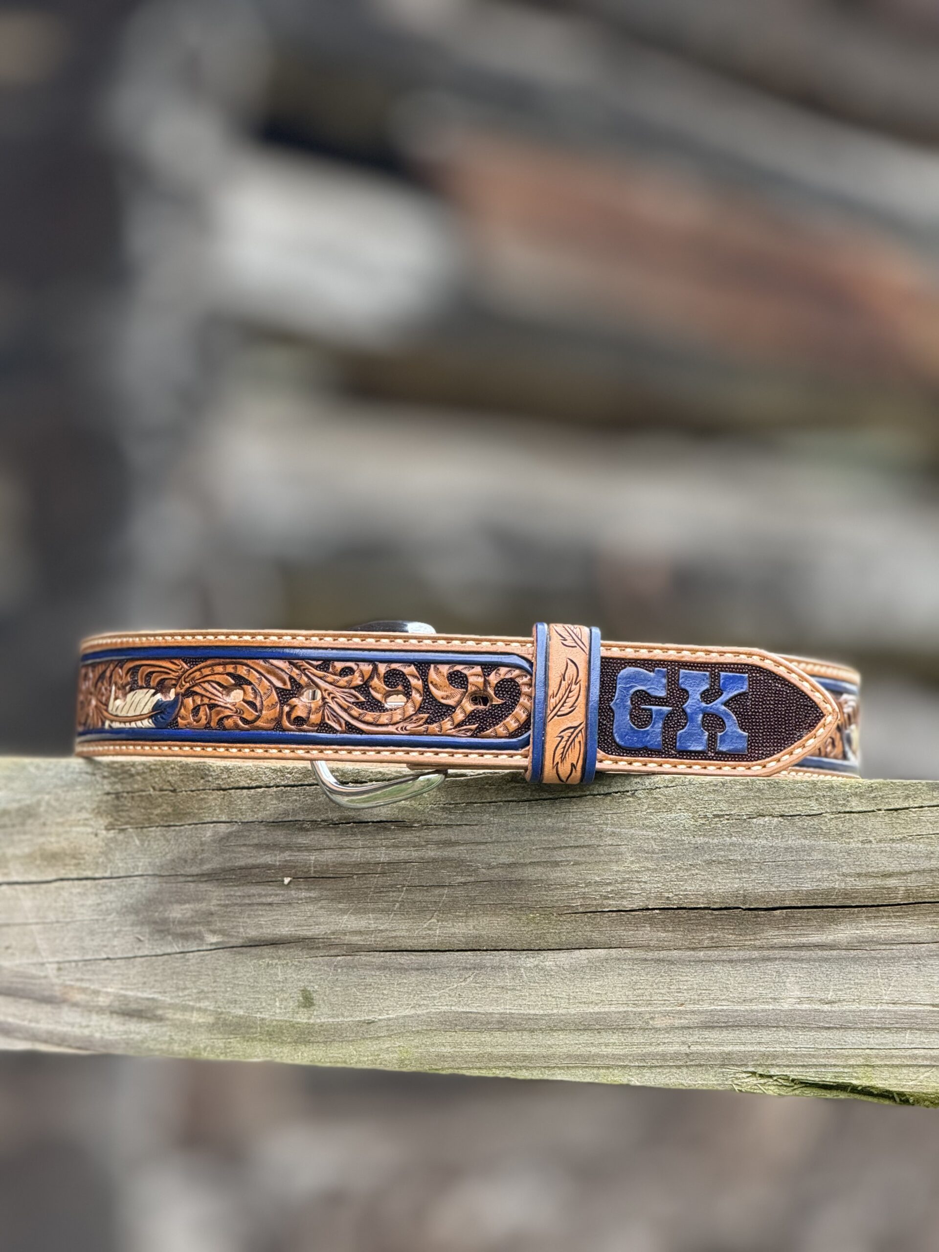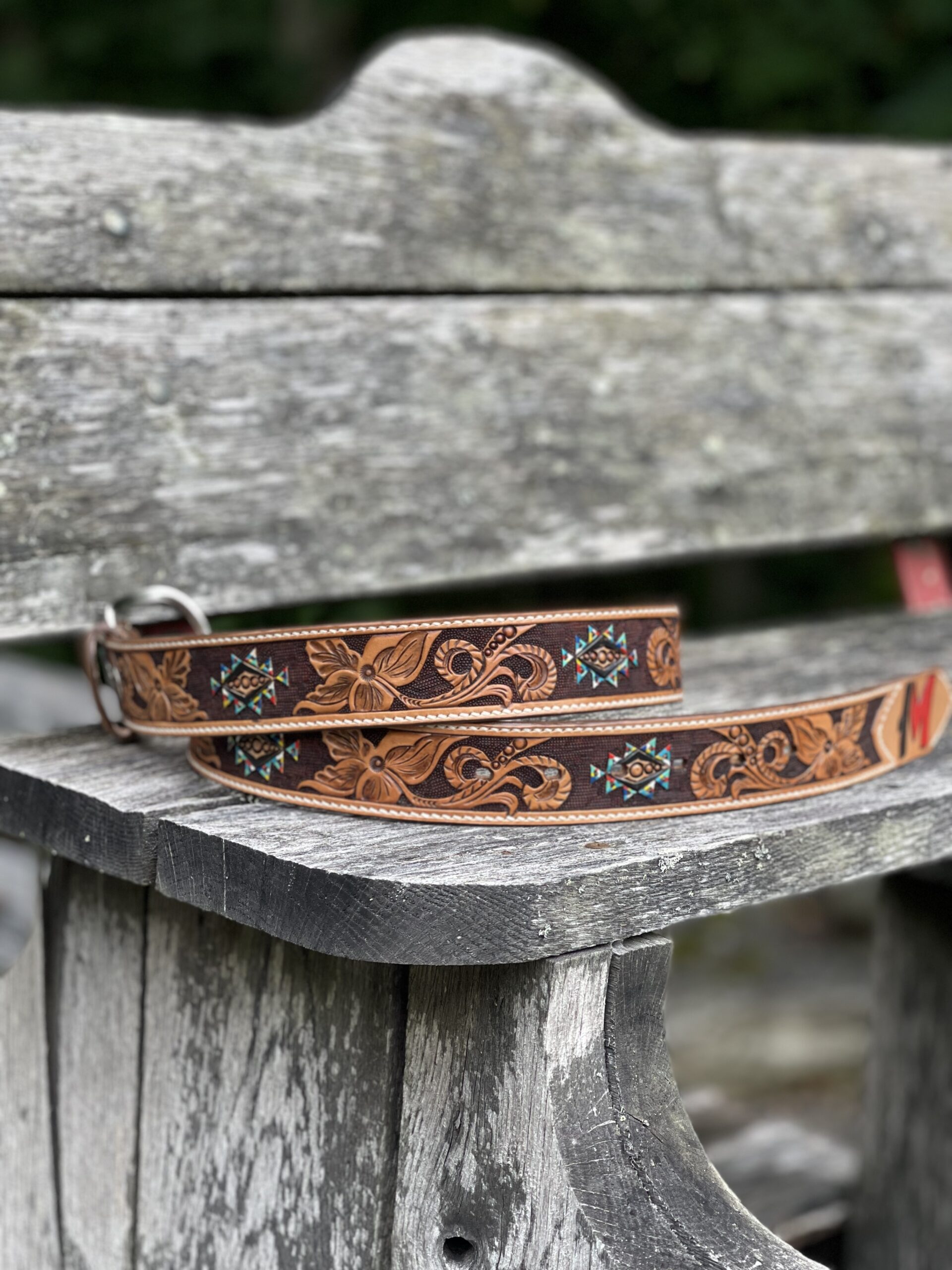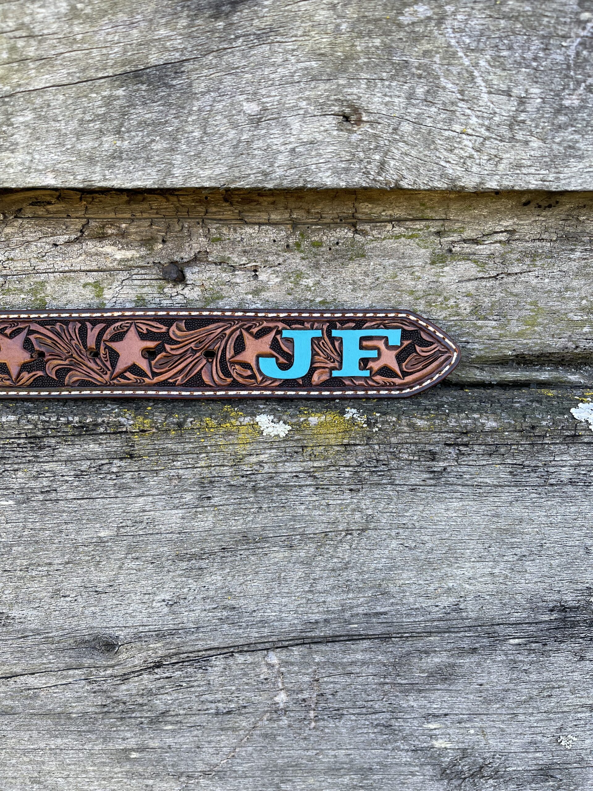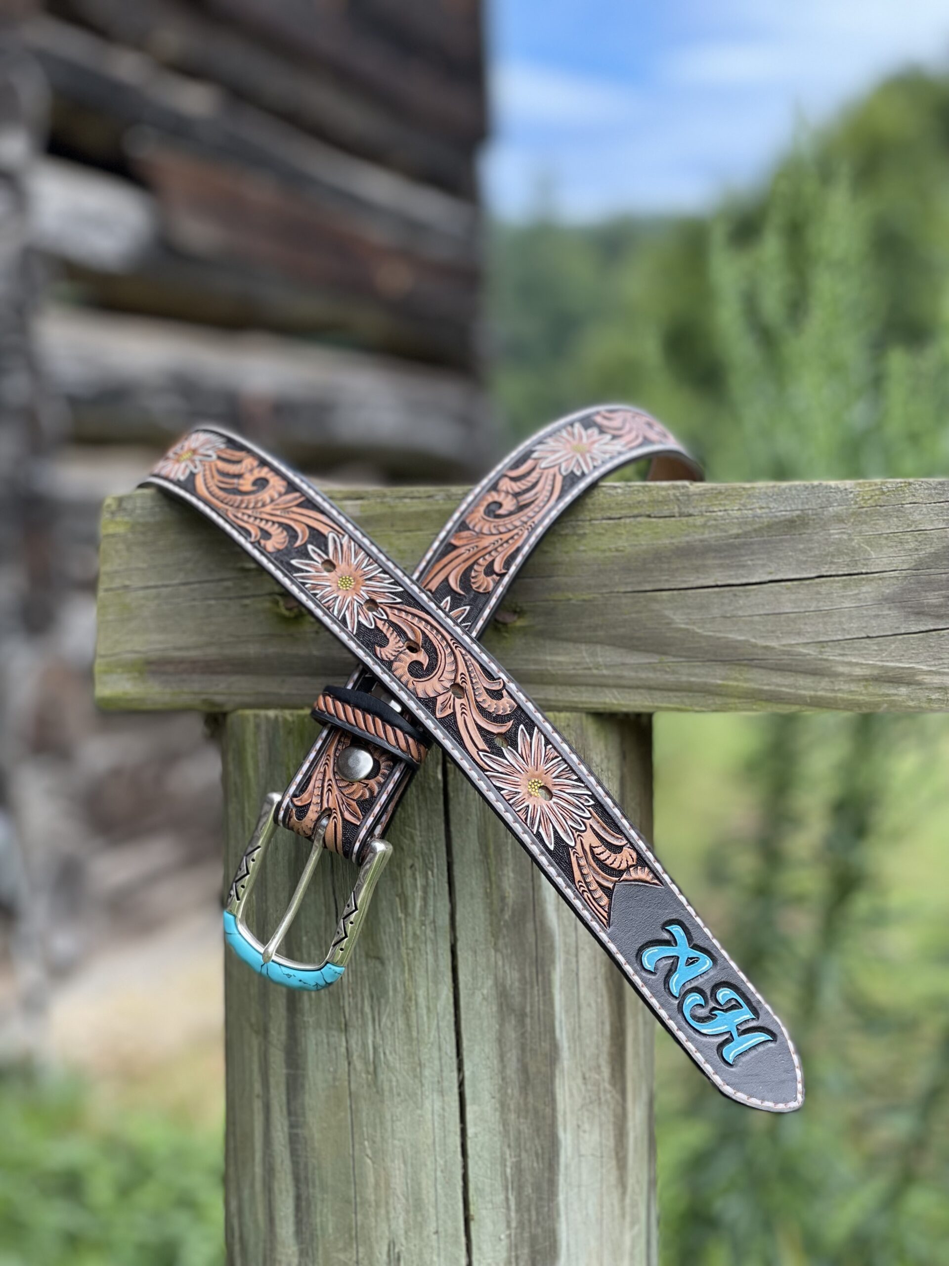 The Works!! Custom tooled belts with stitching and western style buckle.